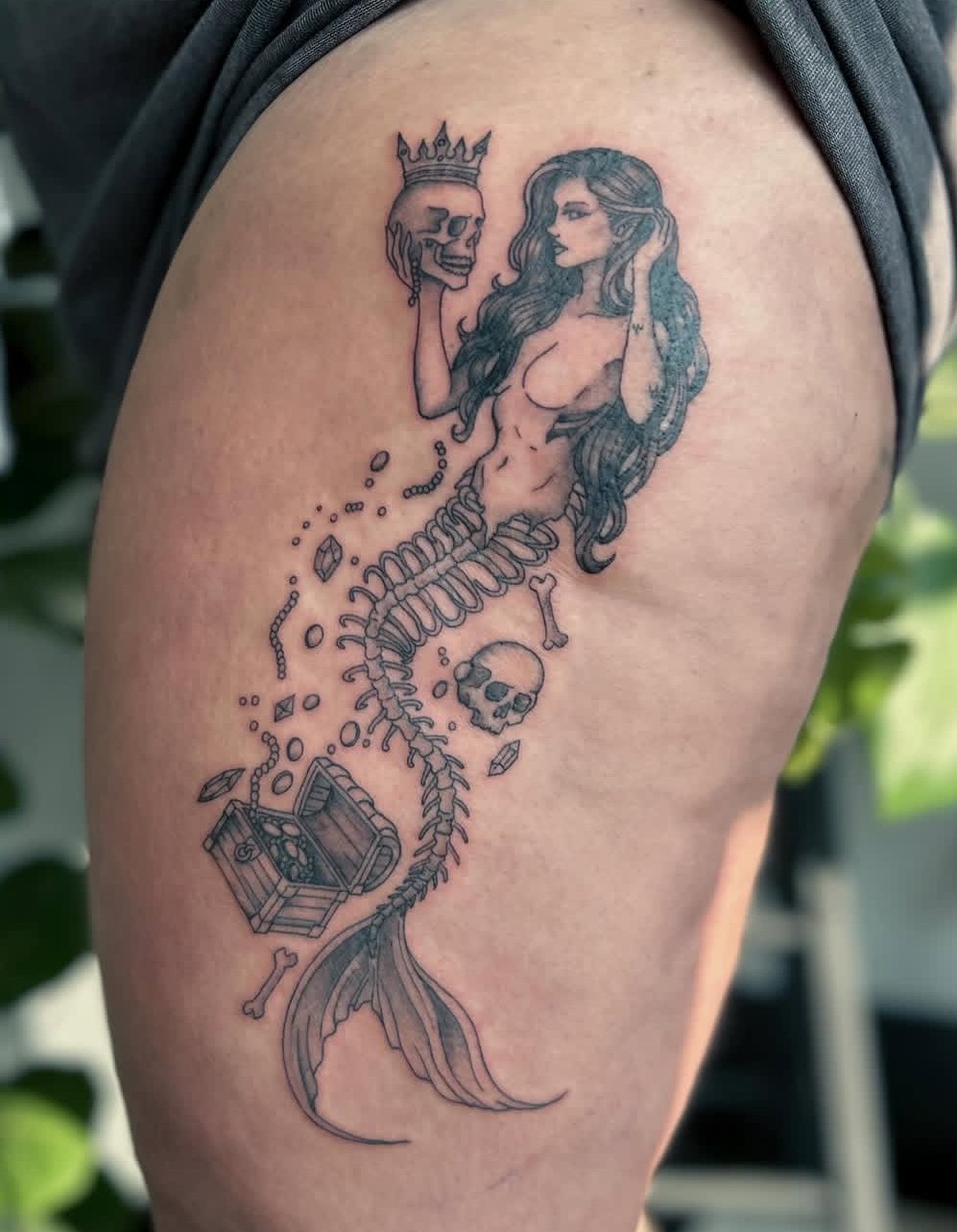 If you ask her what her favourite concepts are she will arrive at horror, landscapes, traditional, and her specialty - cartoons. Skye loves working with colour and has a blended, evolving style of new school mixed with old school; you can count on her for those pieces that pop off the skin!
